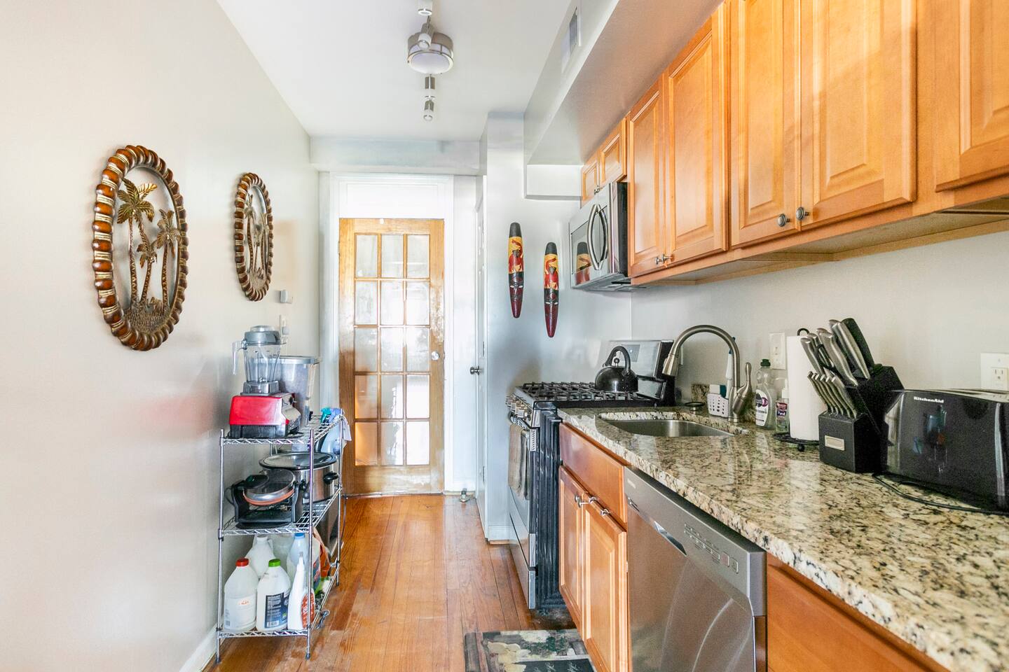 Fully stocked kitchen with comfy living area to share. Just steps away from public transportation.